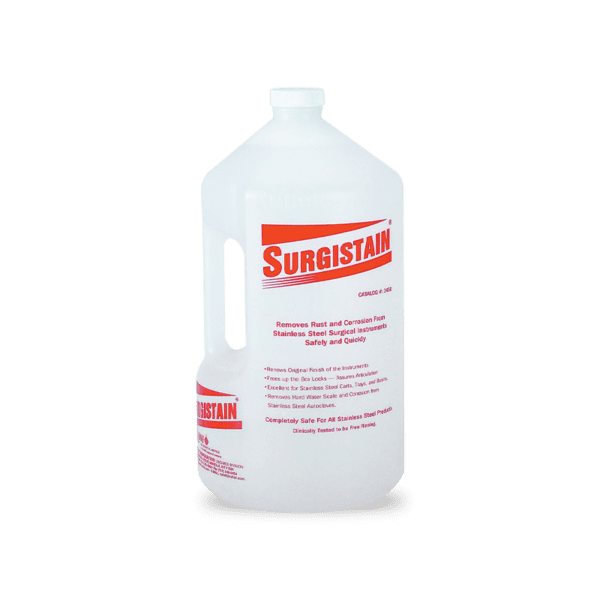 Surgistain® es una solución revitalizante rápida, segura y eficiente que elimina el óxido, las picaduras, las manchas y la corrosión de los instrumentos quirúrgicos de acero inoxidable. Durante más de veinte años, los hospitales de todo el mundo han ahorrado cientos de miles de dólares utilizando Surgistain® para restaurar los instrumentos. Usado rutinariamente como parte del Sistema Ruhof, Surgistain® ayudará a mantener la vida y eficiencia de sus instrumentos y reducir los costos de reparación y reemplazo. Si se usa mensualmente junto con nuestros limpiadores enzimáticos, Surgistain® restaurará el acabado original del instrumento y aflojará las cerraduras y las juntas. Excelente para uso en todos los instrumentos oftálmicos y microquirúrgicos.